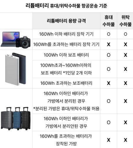 중요한 사항은 160wh 이하 배터리 장착기기는 위탁수화물이 가능하지만, 그 이외에는 모두 휴대수화물로 들고 탑승을 해야 합니다.